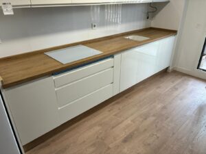 Cocina de estilo moderno y minimalista, diseñada para aportar luminosidad, orden y funcionalidad al espacio. El mobiliario en acabado blanco brillo potencia la sensación de amplitud y limpieza visual, combinado con una encimera efecto madera que añade calidez y equilibrio al conjunto.