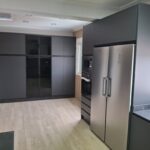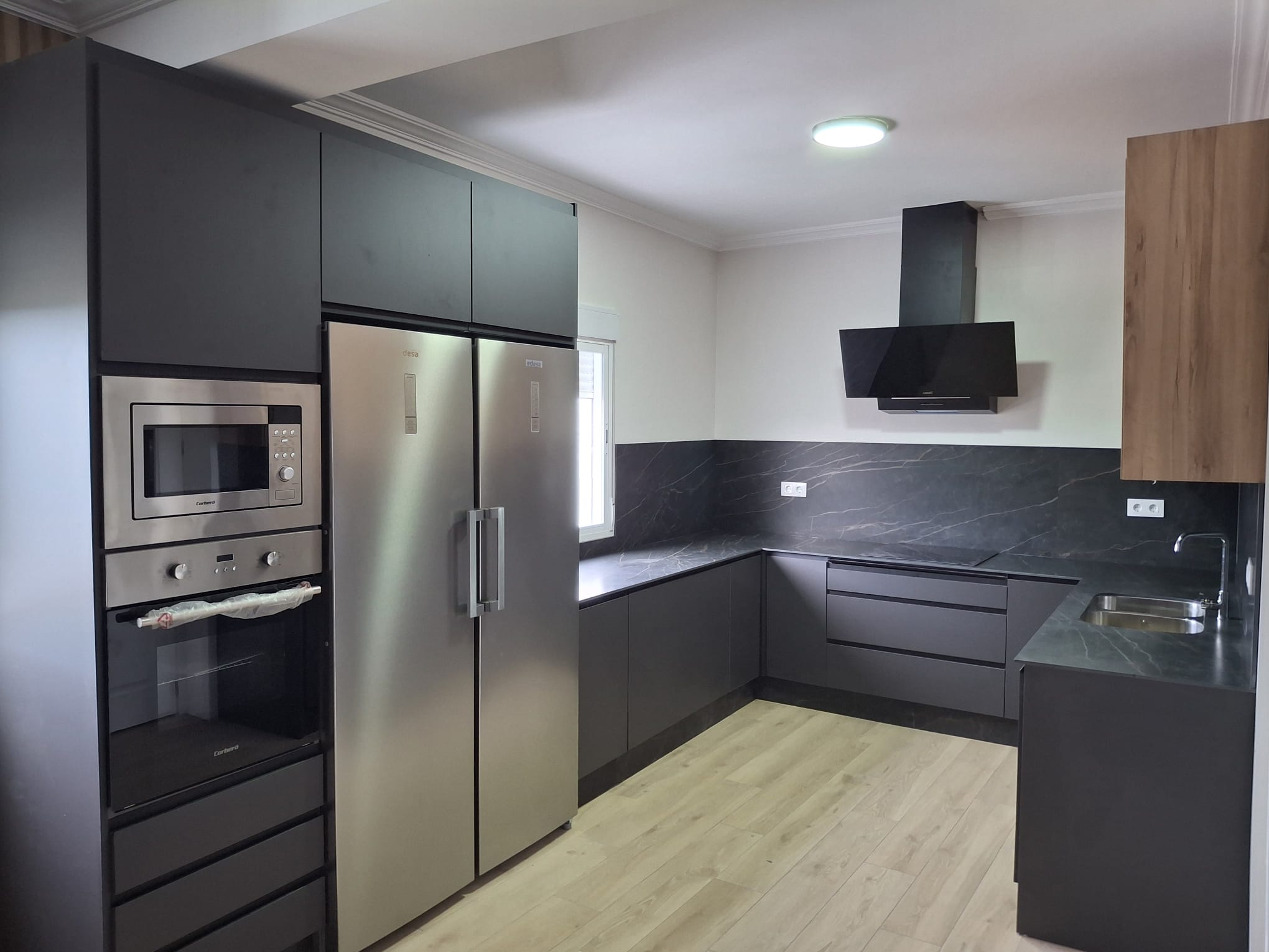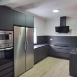 Este proyecto destaca por su diseño contemporáneo y elegante, donde predominan líneas limpias y una combinación equilibrada de materiales. Los muebles en tono gris antracita, junto con encimeras y frontales en porcelánico efecto mármol oscuro, aportan un estilo sofisticado y atemporal.