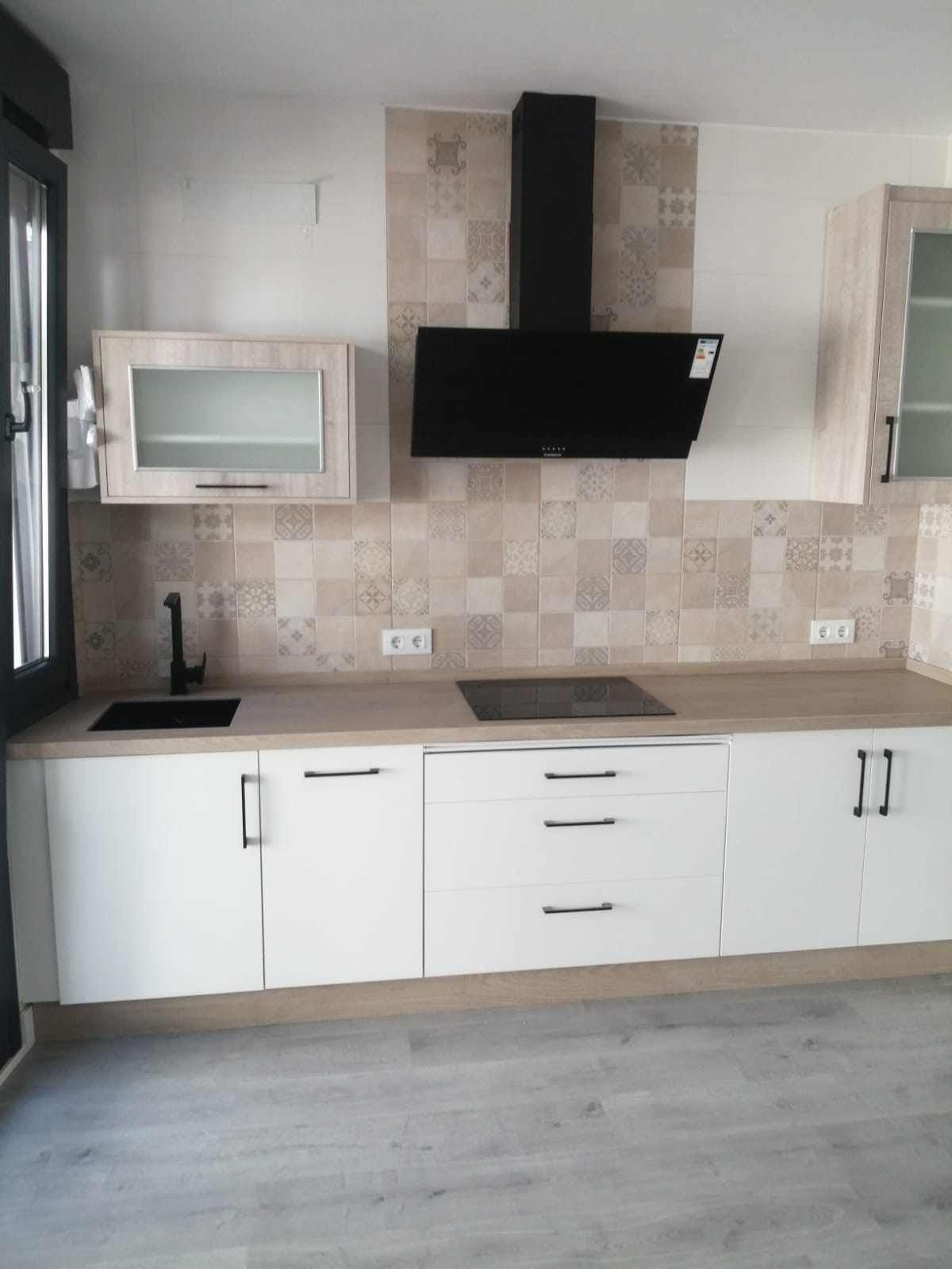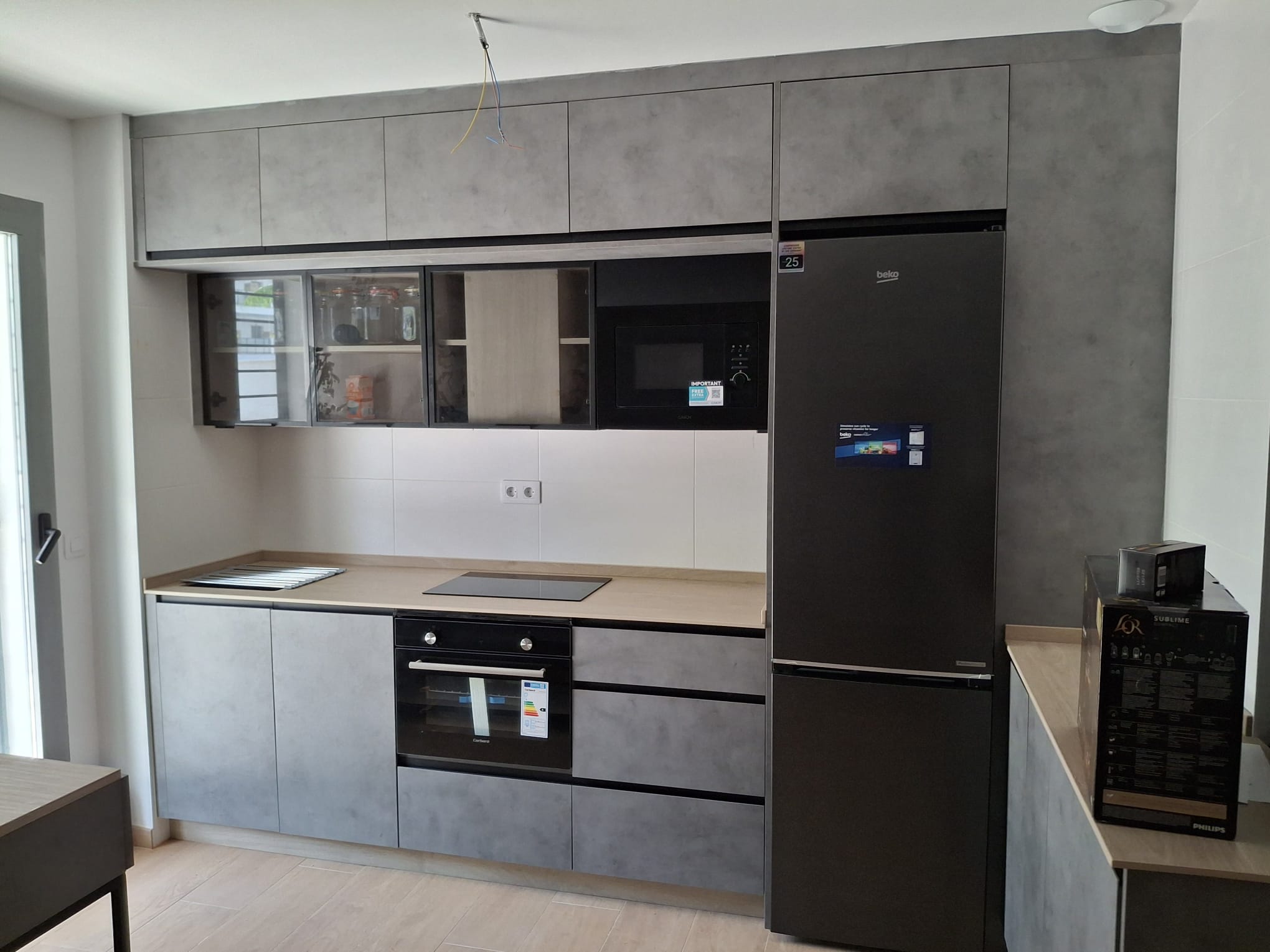 COCINA ACABADO EFECTO CEMENTO Y ENCIMERA MADERA CLARA