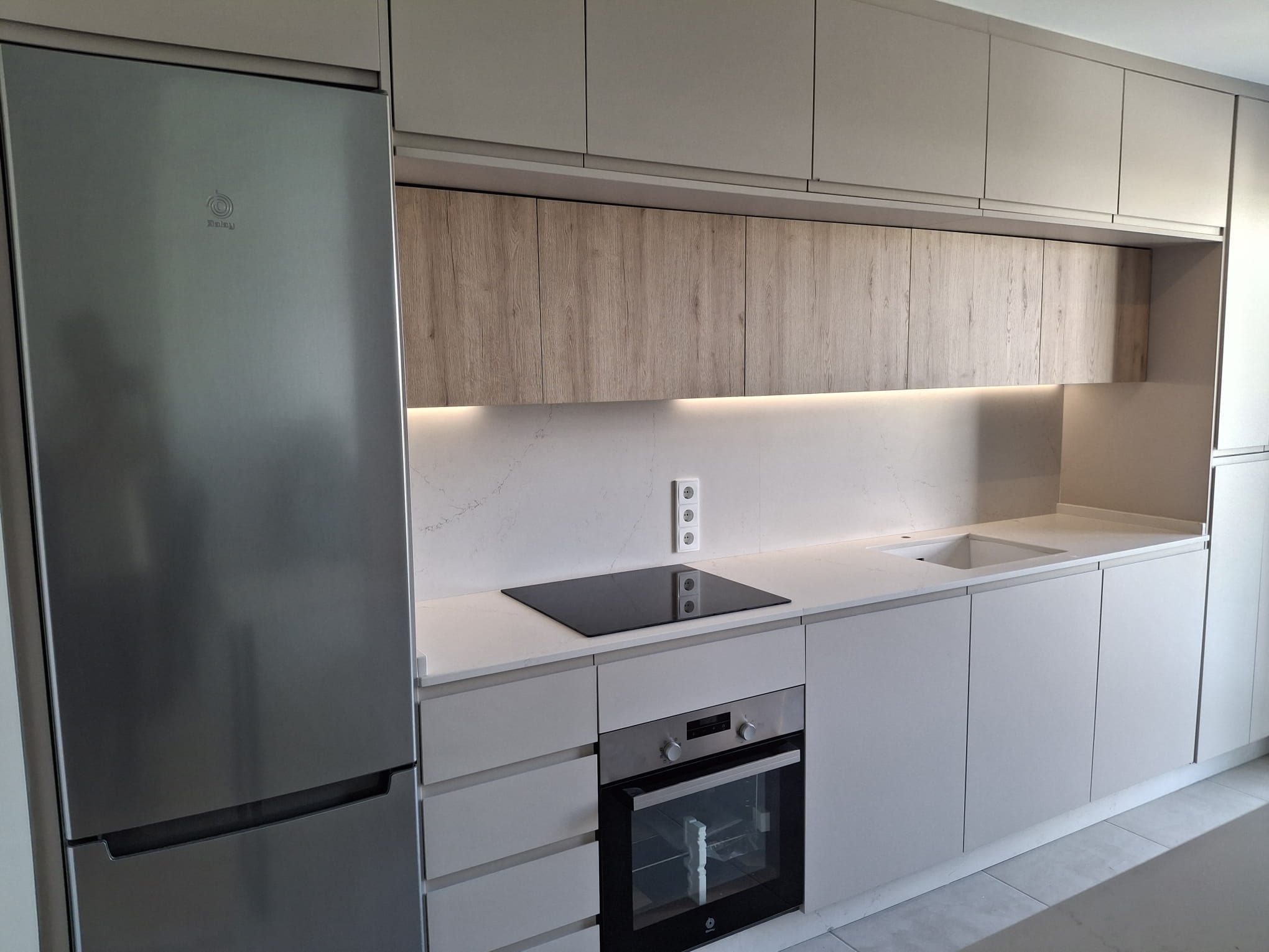 COCINA CON MUEBLES EN TONO NEUTROS COMBINADOS CON MADERA NATURAL