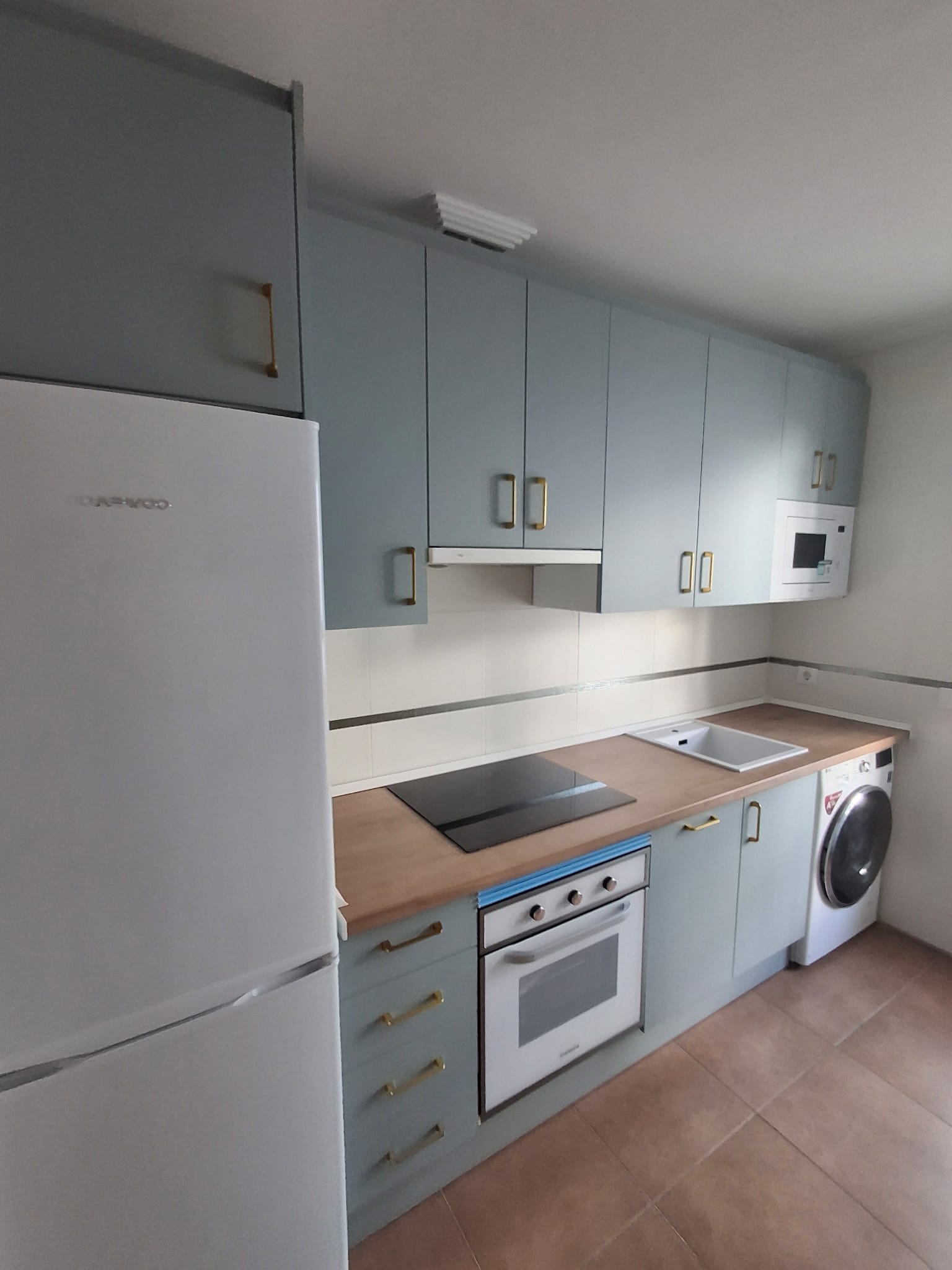 COCINA CON MUEBLES EN TONO VERDOSO MATE Y ENCIMERA EFECTO MADERA