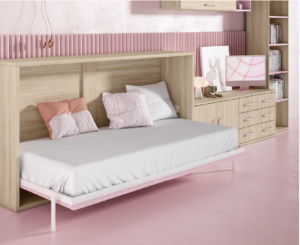Este dormitorio juvenil con cama abatible está diseñado para ofrecer la máxima funcionalidad en espacios reducidos. Gracias a su sistema abatible, la cama se integra perfectamente en el mueble, permitiendo disfrutar de una habitación amplia y ordenada durante el día y de un descanso cómodo por la noche.