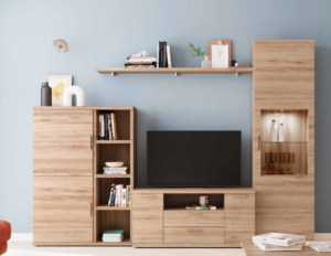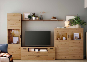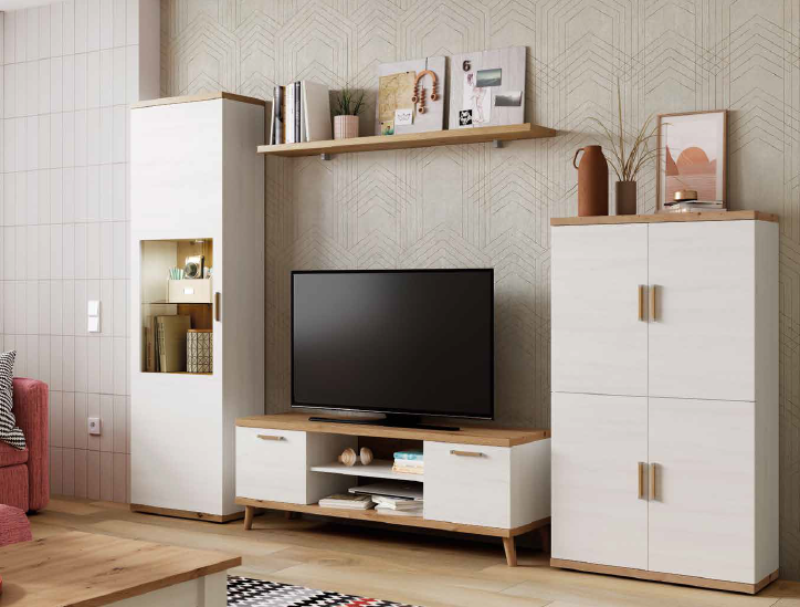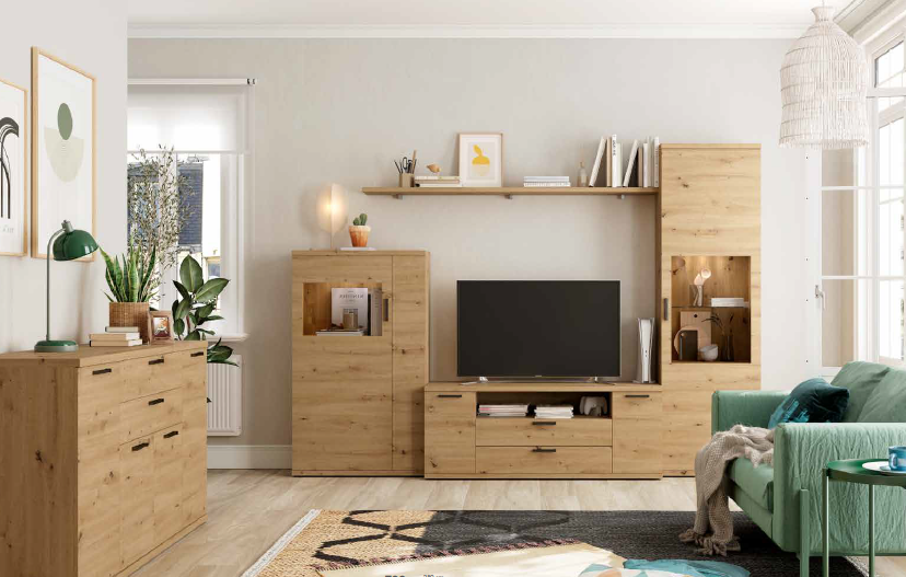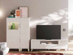 Los salones Kronos destacan por su equilibrio entre estética y funcionalidad: muebles altos con vitrinas para exponer tus piezas favoritas, estanterías decorativas, módulos bajos ideales para tu televisión y amplias zonas de almacenaje que te permiten mantener todo en orden sin renunciar al diseño.