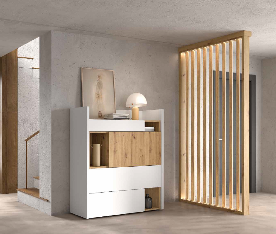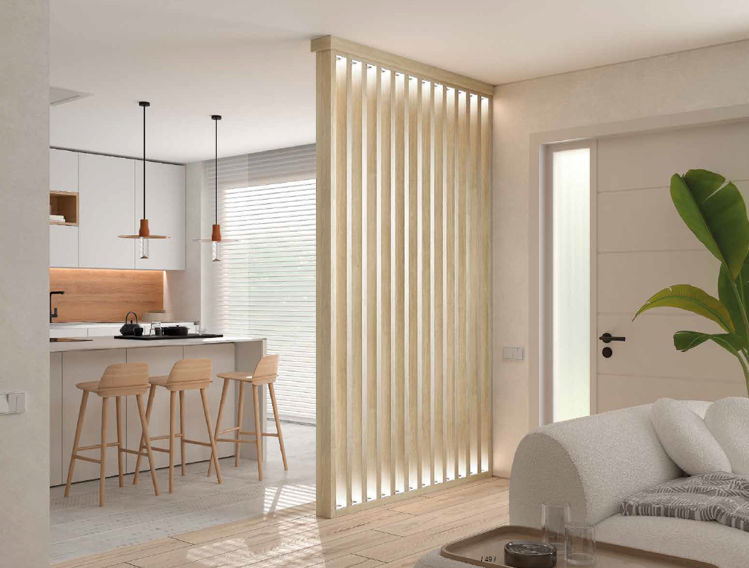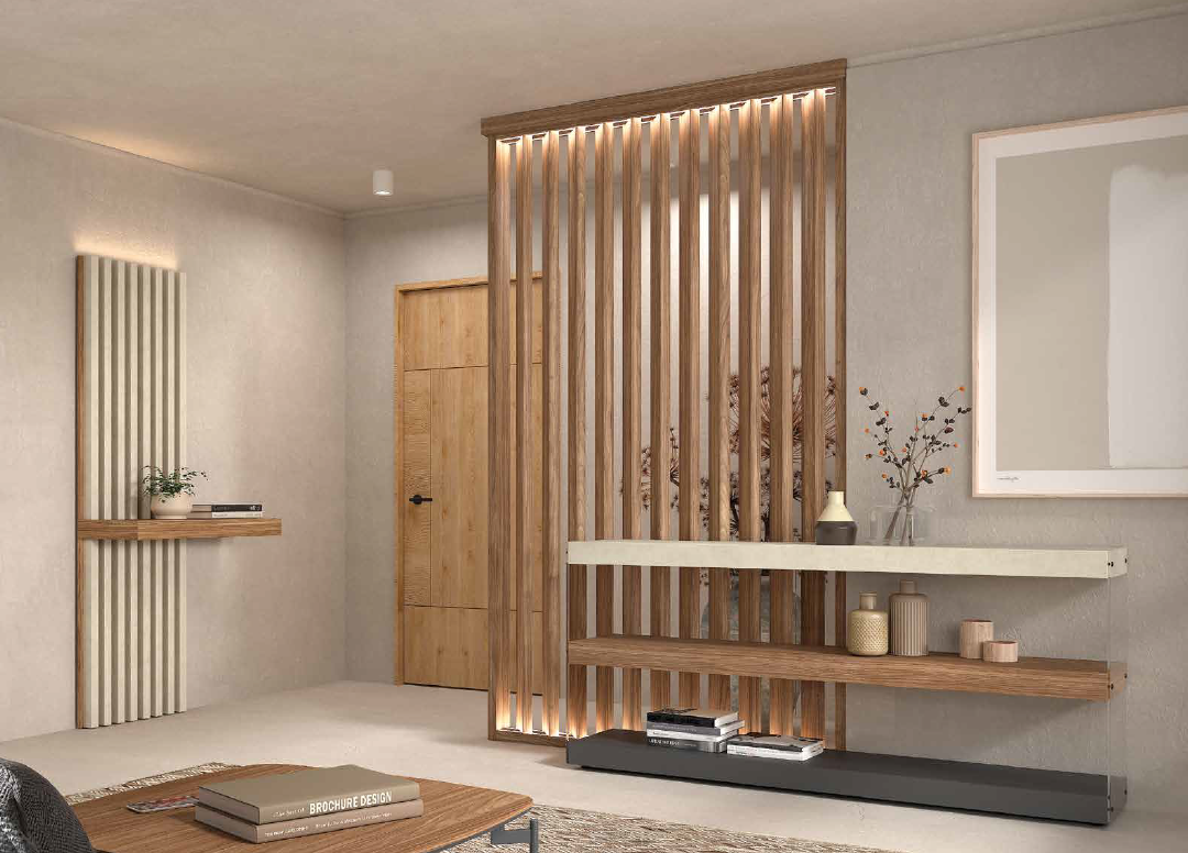 Descubre cómo transformar tus espacios con diseños modernos que combinan calidez, funcionalidad y estética contemporánea. Nuestros ambientes integran paneles decorativos en madera con líneas verticales que pueden incorporar iluminación LED integrada, creando separaciones sutiles que aportan privacidad sin perder amplitud visual. Esta iluminación aporta un efecto elegante y acogedor, realzando las texturas y formas del mobiliario.